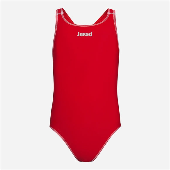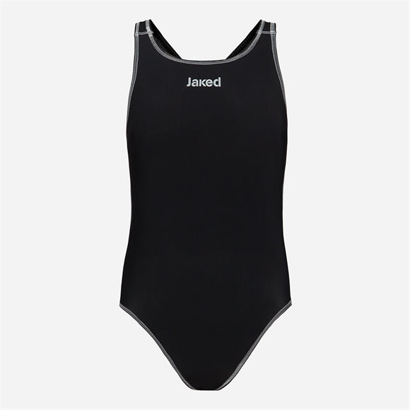 Girls' swimsuit for swimming and pool training sessions. This slim fit style, with its skin-tight, compression fit, has been specifically designed for athletes and professionals. It has straps that cross at the back and the Jaked logo on the front.